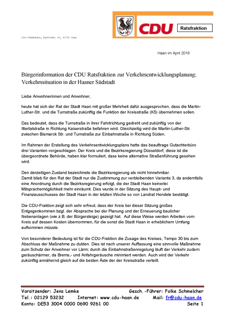 Liebe Anwohnerinnen und Anwohner, heute hat sich der Rat der Stadt Haan mit großer Mehrheit dafür ausgesprochen, dass die Martin-Luther-Str. und die Turnstraße zukünftig die Funktion der Kreisstraße (K5) übernehmen
