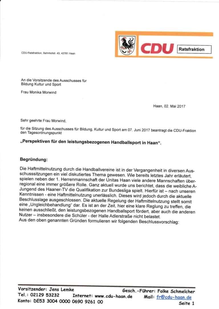 Die CDU Haan stellt eine Antrag zum Thema „Perspektiven für den leistungsbezogenen Handballsport in Haan“